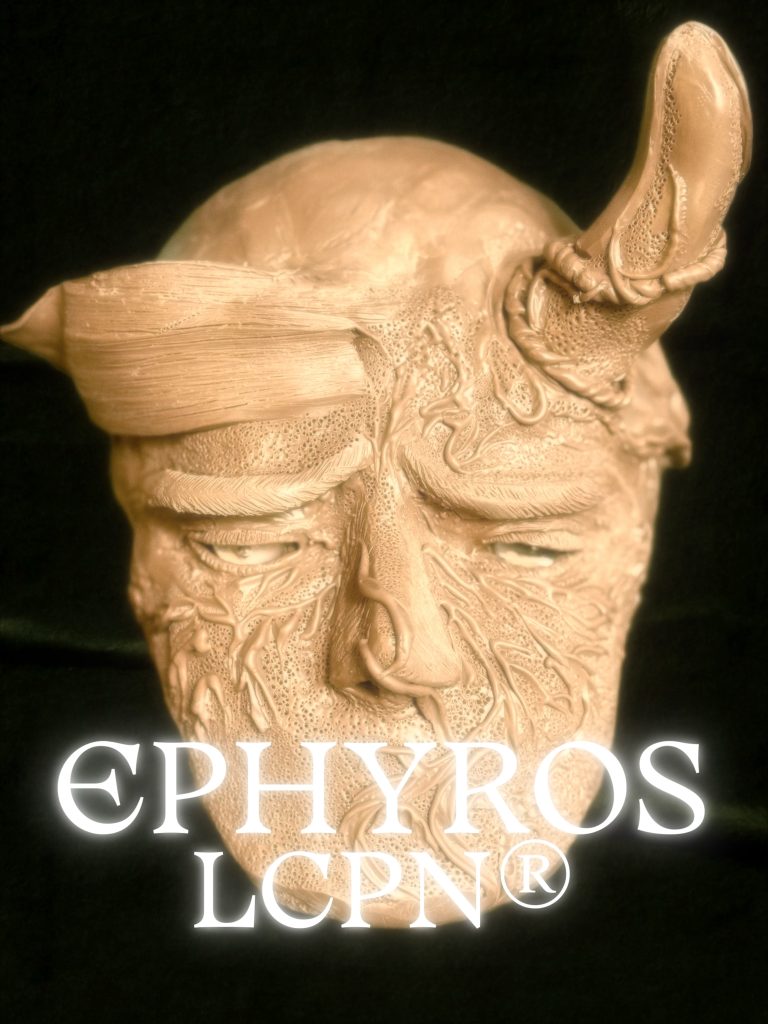 Ephyros porte sur son visage la mémoire des métamorphoses : ses veines s’enchevêtrent comme des racines cherchant la lumière, tandis qu’un fragment de corne s’élève, vestige d’un ancien pouvoir.